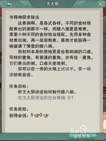 继续通过任务指引,到王大厨处交任务,可以领到新任务:寻得神厨求秘法。任务要求在王大厨附近的灶台制作腊八粥,制作一个普通腊八粥即可,交任务,可以接到新任务:精湛厨艺的美味。