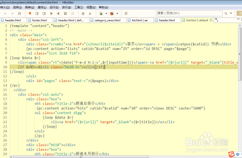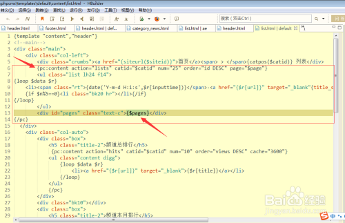 第五步:用开发工具打开list.html文件之后,找到调用分页的标签代码,发现{$pages}可以显示分页页码,但要注意,{$pages}代码是被{pc}标签包含,如果没有被{pc}标签包含,就无法显示页码。