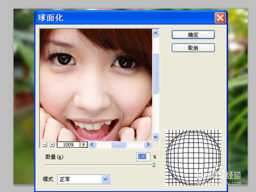 执行滤镜-扭曲-球面化命令,在弹出的球面化对话框中采用默认数值,点击确定,执行ctrl+f组合键。