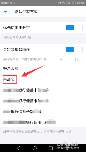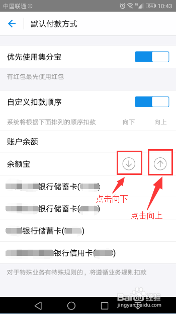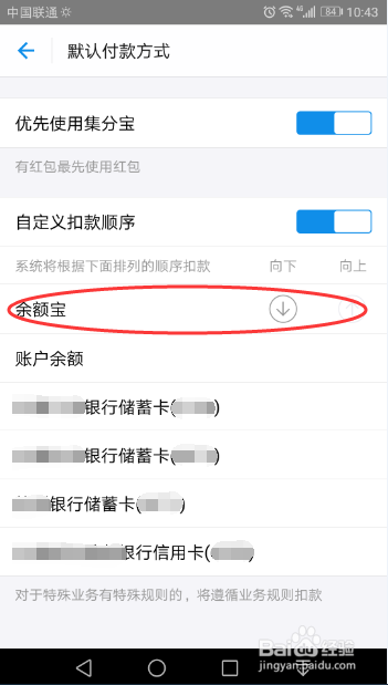 进入【默认付款方式】页面后,可以看到你目前的扣款顺序。如果要调整某种方式的扣款顺序,点击该方式一下。