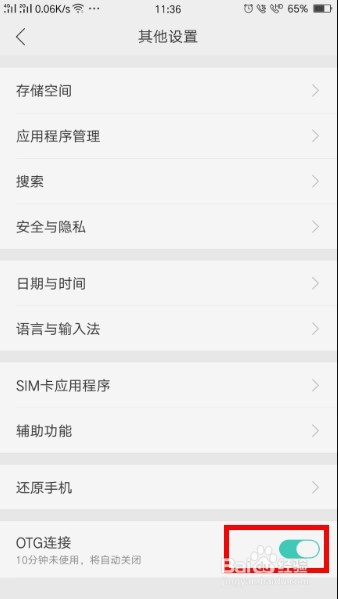 第三步:在其他设置中,我们可以看到最后一项就是OTG连接,OPPOr9m自带的功能是10分钟不用otg会自动断开,所有我们在想用otg的时候需要启用otg。