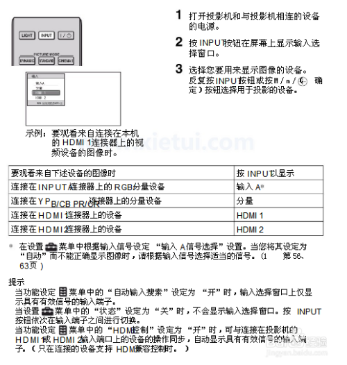 第六:调整图像位置和连接投影机录像机和电脑。当进行连接投影机时,进行任何连接前关闭所有设备。正确使用各连接用的电缆。正确地插入电缆插头;插头连接不牢固时可能会导致故障或图像质量下降。在拔出电缆时,务必拔插头,不可拉扯电缆本身。