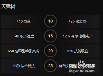 天赋树。10级进攻性强可加攻击力,保守一点加力量.15级选择技能冷却时间.20级 30%技能吸血,25选择附带恐惧效果。女王天赋是爆炸强,使其从一个前中期英雄变成了前中后期都非常强势的英雄,还附有短cd的团控技能。
