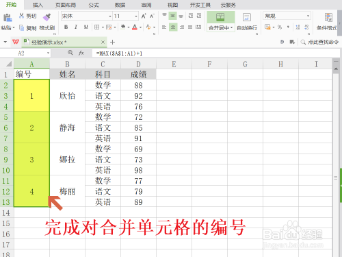 合并单元格生成编号结果。