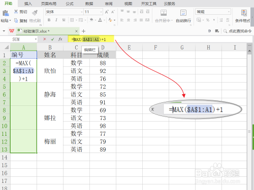 选中所有格式化好的空白合并单元格,在编辑栏中输入函数公式“=MAX($A$1:A1)+1”,注意公式中的符号全部为英文符号,否则会报错。