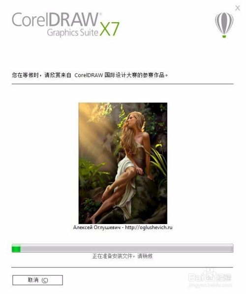 进入安装进度对话框,显示正在安装此文件,可以欣赏来自CorelDRAW国际设计大赛的参赛作品,如下图所示:
