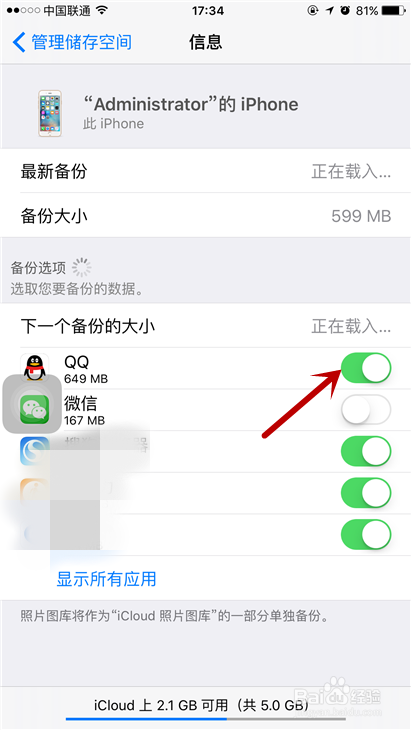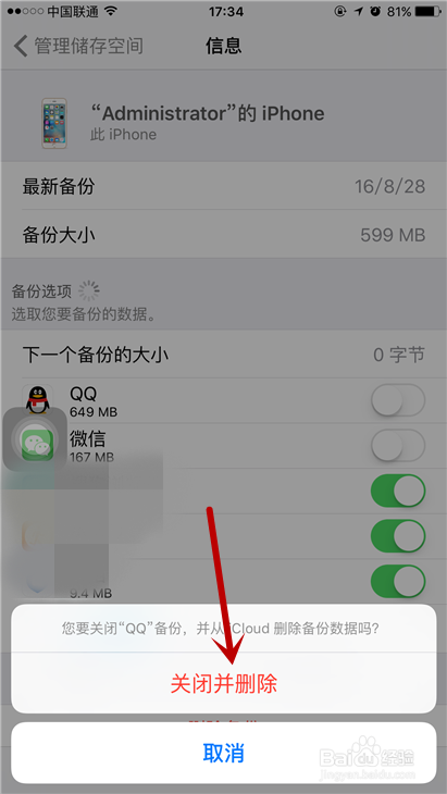我们可以先选择关闭一个小项。因为如果直接点击删除备份的话,可能系统不允许,所以先点击一个。