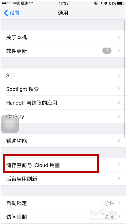 接着往下滑动你的屏幕,你会看到下面有一个选项是存储空间和iCloud用量,点击它。