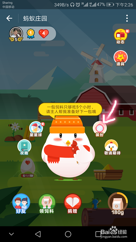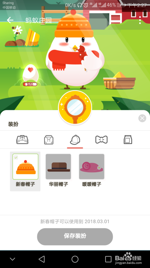 “支付宝”——"蚂蚁庄园"——“爱心小鸡”,下图是我的蚂蚁庄园,我的爱心小鸡已经做好了新春装扮,此新春装扮可以使用到2018.03.01.
