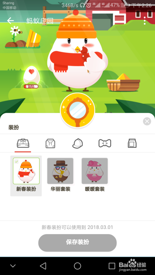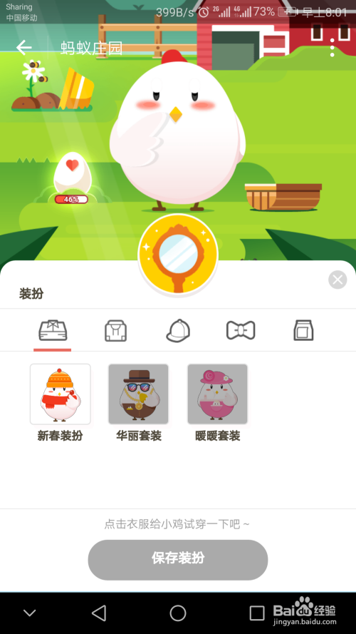 第三步,点击“新春装扮”,点击“保存装扮”,爱心小鸡就装扮好了。