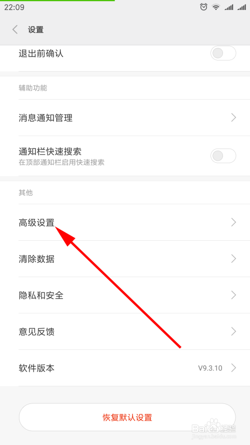 点击设置界面的“高级设置”选项,打开“高级设置”界面。