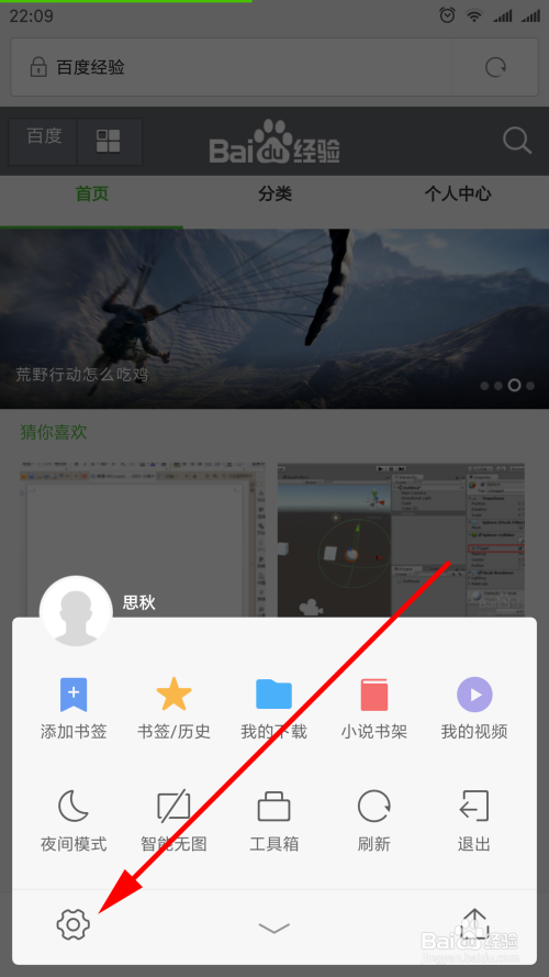 使用安装在手机上的浏览器进入百度经验首页,点击图示的“功能选项卡”按钮,弹出其包含的功能组。