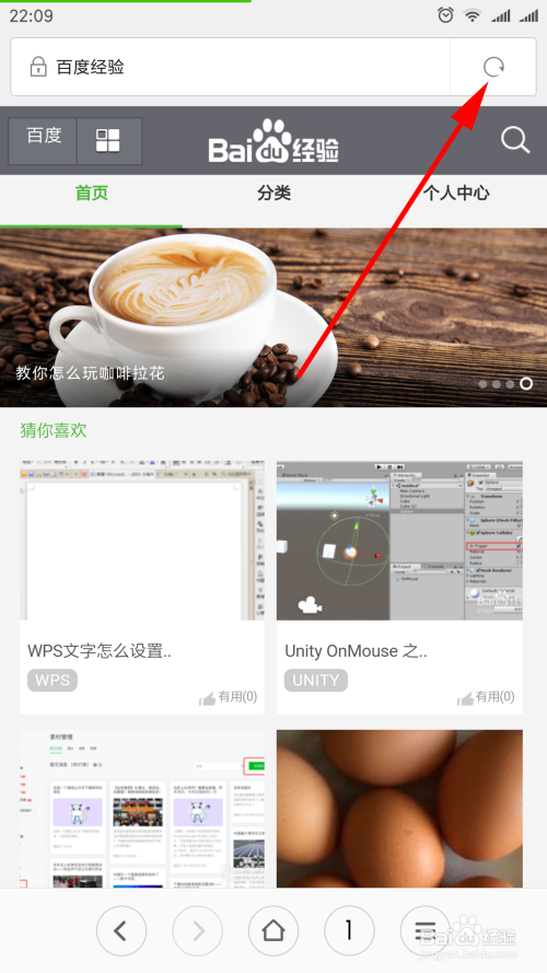 在百度经验主页中,点击图示的“刷新”按钮,手机中将显示电脑版的浏览界面。