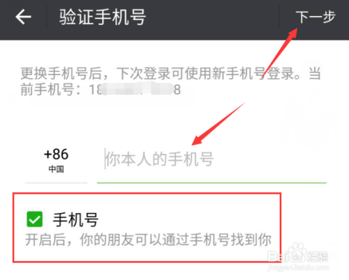 此时打开验证号码界面,输入新号码后,根据需要决定是否勾选图中方框所示内容,接着点击“下一步”。