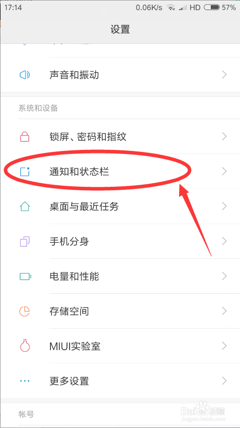 然后,在设置页面向下滑动,找到“通知和状态栏 ”,点击打开 。