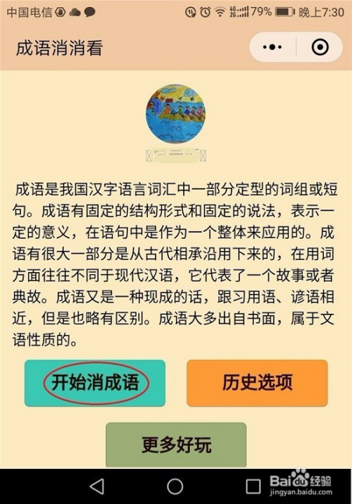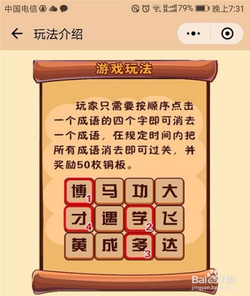 点击“开始消成语后”,系统给出游戏规则及玩法示例,就是依次点出你看到的某个成语。