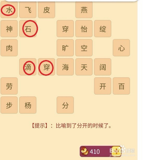 方法二:根据下图中圈出的提示释意,找到对应的成语后,点击该成语后消失,接着根据下面的提示找下一个成语。