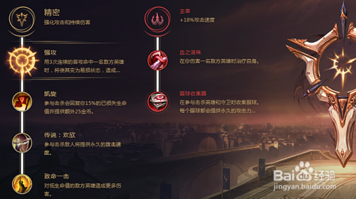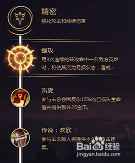 精密系的第一个基础符文选择的是“传说:欢欣”,攻速对战争女神这样的ADC来说是输出的关键,所以欢欣是必须要点的。