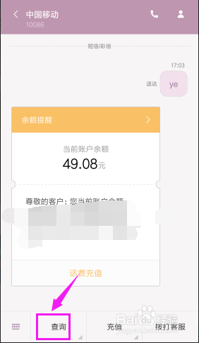 查询余额:在收信人处写入:10086;在短信处输入:ye,如图。点击”发送“。