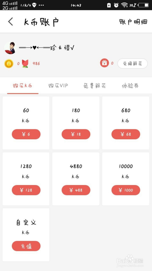 我们点击“K币账户”,就会在“K币账户”中看到每一个K币的价格,6元=60K币,也就是说1K币值1毛钱。我们可以通过购买的方式来获得K币。