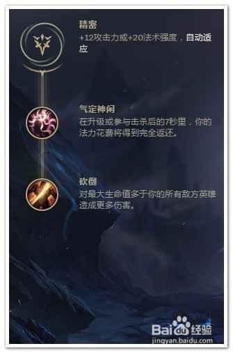 选择“精密”作为“副系符文”(强化攻击和持续伤害)。在副系符文1 里,选择“气定神闲”。击杀或者协助击杀返回耗费蓝量,弥补了维克托的蓝量不足问题;在副系符文2 里,选择“砍倒”,打坦速度更快。