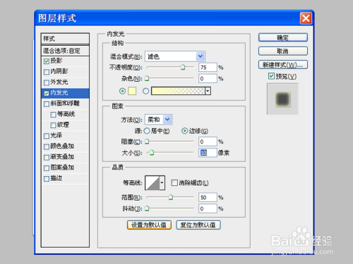 切换到内发光选项,设置混合模式为滤色,设置图案大小为10。