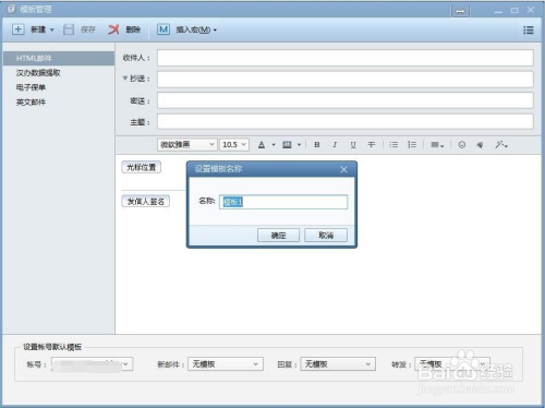 单击新建按钮后,弹出设置模板名称对话框,自此处填写你设置的模板名称,例如:我填写“放假通知”;填写好之后,单击确定