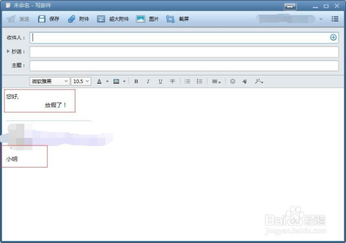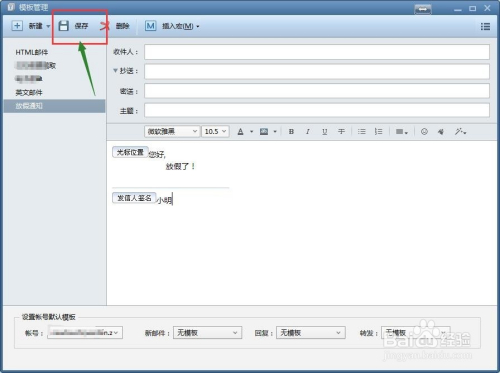 接下来便是设置你发邮件的模板内容了,找到右侧,在光标位置处,填写你编辑好的文字,在发件人签名处,备注发件人相关信息,如图所示