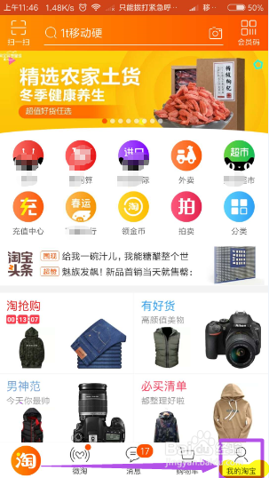 点击桌面的‘手机淘宝’图标来打开它,打开之后默认来到它的淘首页。