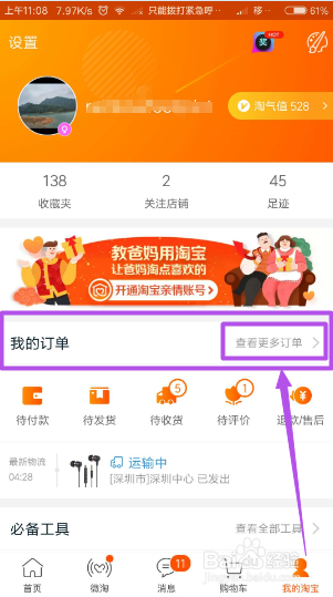 然后在打开的“我的淘宝”页面中可以看到一个‘我的订单’这个选项,然后点击它后面的“查看更多订单”。