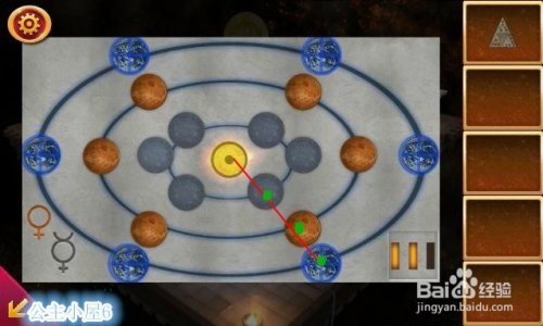如下图绿点所示小编点亮右下角第一个灯。方向顺序无所谓,主要是找准正确的球。