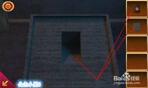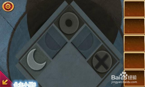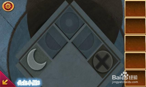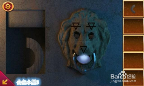 点击右侧墙上的头像,将外面的木板点开,按照刚才的图示上三角所对应的提示,将土放入双眼,水雾放入口中,旁边打开,得到另一片半圆。