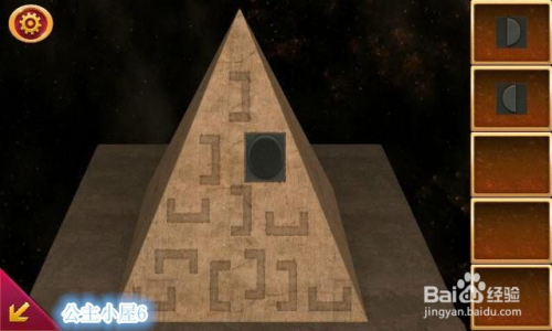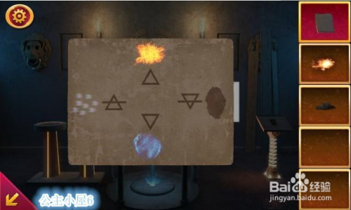 点击左侧墙上头像,按照上步得到的图示上的三角图形所对应的提示,将火放入头像的双眼,将土放入头像的口中,旁边打开得到一片半圆和载有水滴的卡片。