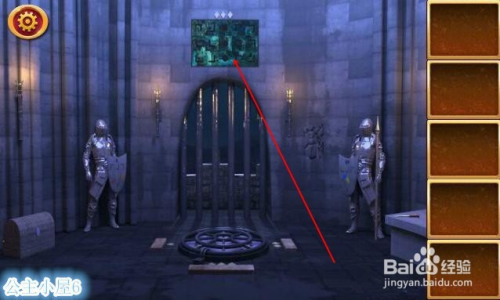 点击右侧雕像,收取雕像手臂上的长枪。同样记录下盾牌上出现的图形和旗帜的颜色和旗帜在旗杆上的位置。并点击地上井盖右侧有两个菱形标志的部分,放大后将在盾牌上记录的图形调整出来。