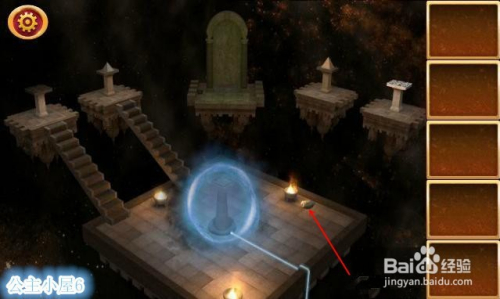 点击石门,收取下方一块半圆图形。点击中间石台,将收取的半圆图形安放到石台上,现将台上的两块半圆收起。此时连接右侧上方第二个台的阶梯出现了。