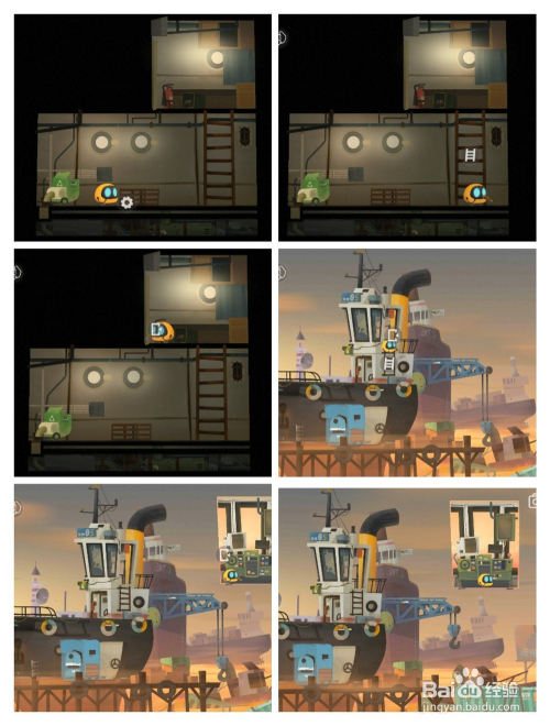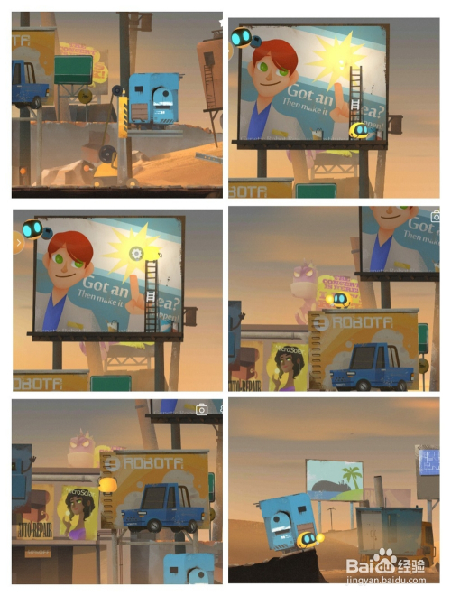 然后艾彼顺着原路返回走出轮船,顺着右边一直走,来到一个广告牌前,蓝色小车下面有个开关,拉开关广告牌上的灯就会亮,这时怎么上到广牌上拿到灯泡呢?点开右上角看星号提示,利用两个人的跷跷板上去。