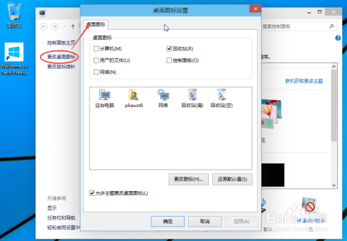 点击个性化进入个性化窗口,点击个性化窗口上的更改桌面图标,如下图所示。