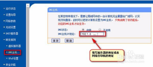 一, 登录路由器管理界面-----转发规则----DMZ,输入内网的服务器或网络打印机地址。
