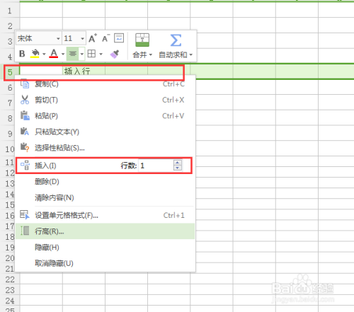 选中表格的行,右键单击-----选择“插入行数”。(新插入的行在所选择的行上方插入)