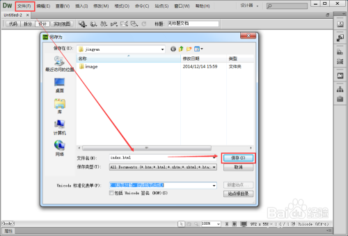 新建HTML页面后,点击文件--->保存,把新建的HTML保存下,不然后面做页面背景图片不行。如下图所示。