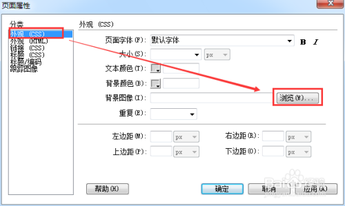 打开页面属性后,选择外观分类,然后点击背景图像后面的浏览,选择背景图片,如下图所示。