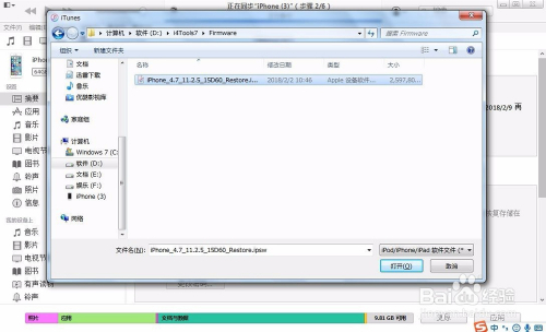 接着回到电脑上的itunes软件界面,再次按住shift键点击恢复iphone选项,然后就会跳出选择固件的窗口,这里选择之前下载好的固件,然后点击打开选项,接下来等待itunes软件更新完成即可。