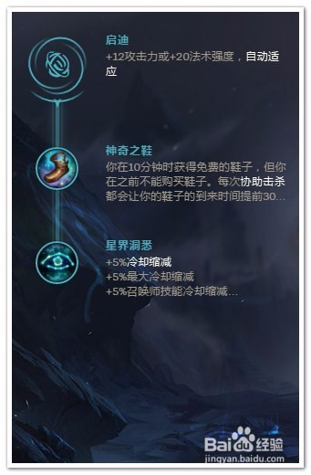 选择“启迪”作为“副系符文”(创造性的工具并扭转常规)。在副系符文1 里,选择“神奇之鞋”,辅助经济收入低,加快卡尔玛发育节奏;在副系符文2 里,选择“星界洞悉”,四种减CD,一般AP都喜欢点出的符文。