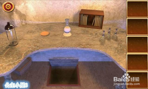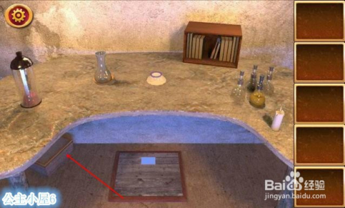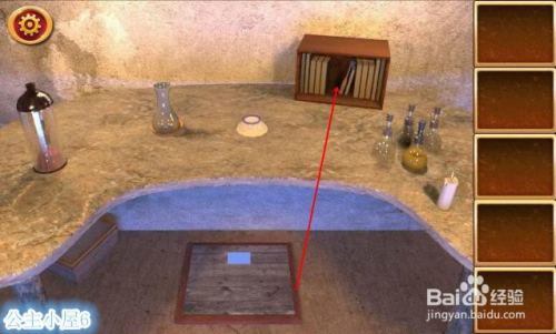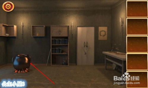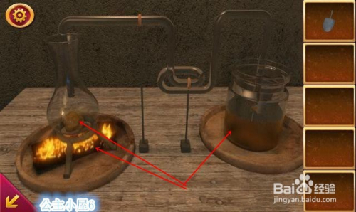 收取前方柜子下方的小罐子。点击右侧木架,将小石头放到烧瓶中,将小罐子放到另一边的盘子上。将木柴放到烧瓶下方。小罐子变色,再将小罐子收取。