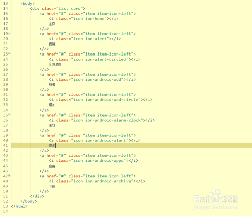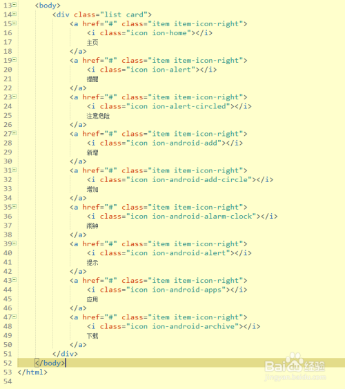 第三步,利用<a></a>标签插入小图标,这里选择ionic框架自带的小图标,结合<i></i>标签元素插入,这样看起来更为美观,如下图所示: