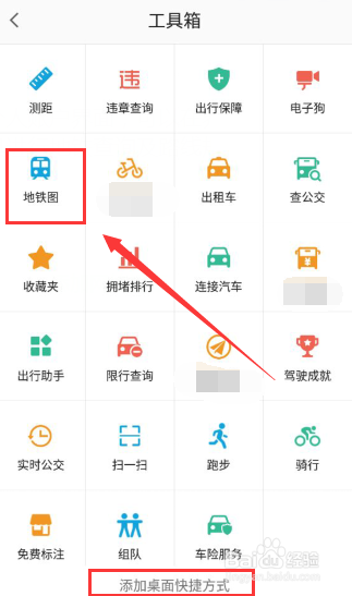 打开工具箱后,可以看到较多工具,如拥堵情况查询等,这里点击查地铁,即可进入查询界面,如果需要将该工具添加到桌面,可以点击最下方按钮。