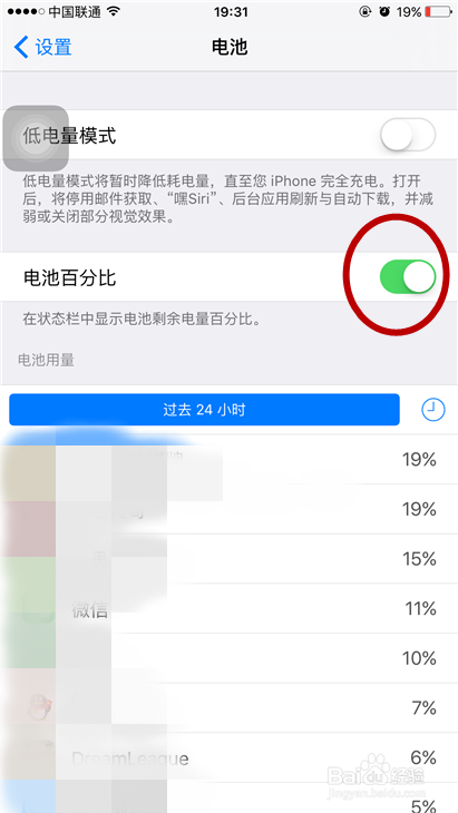 进入设置后,我们会看到上面的第二个选项叫做电池百分比,而后面有一个按钮,默认是灰色的。