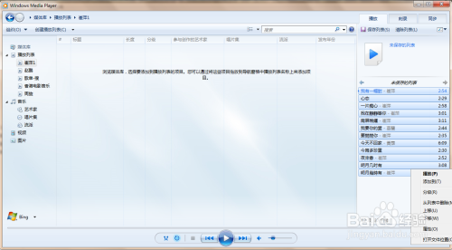 点开Windows Media Player的播放列表界面后,将已选择好的音乐拖拽至界面右侧“未保存的列表”下会出现“添加到播放列表”的字样;这样刚才选择的音乐就会出现在“未保存的列表”下。