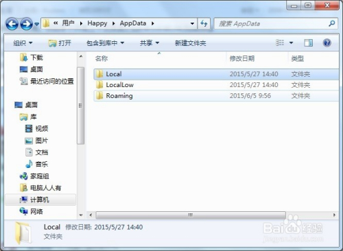 打开AppData文件夹,里面有三个文件夹Local、LocalLow、Roaming。