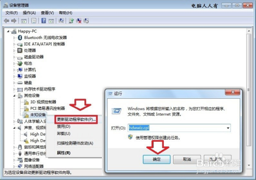 使用Win+R调出运行,在其中输入:devmgmt.msc 回车(Enter)打开设备管理器→右键点击有黄色警示图标的设备→更新驱动程序软件(保持联网)。